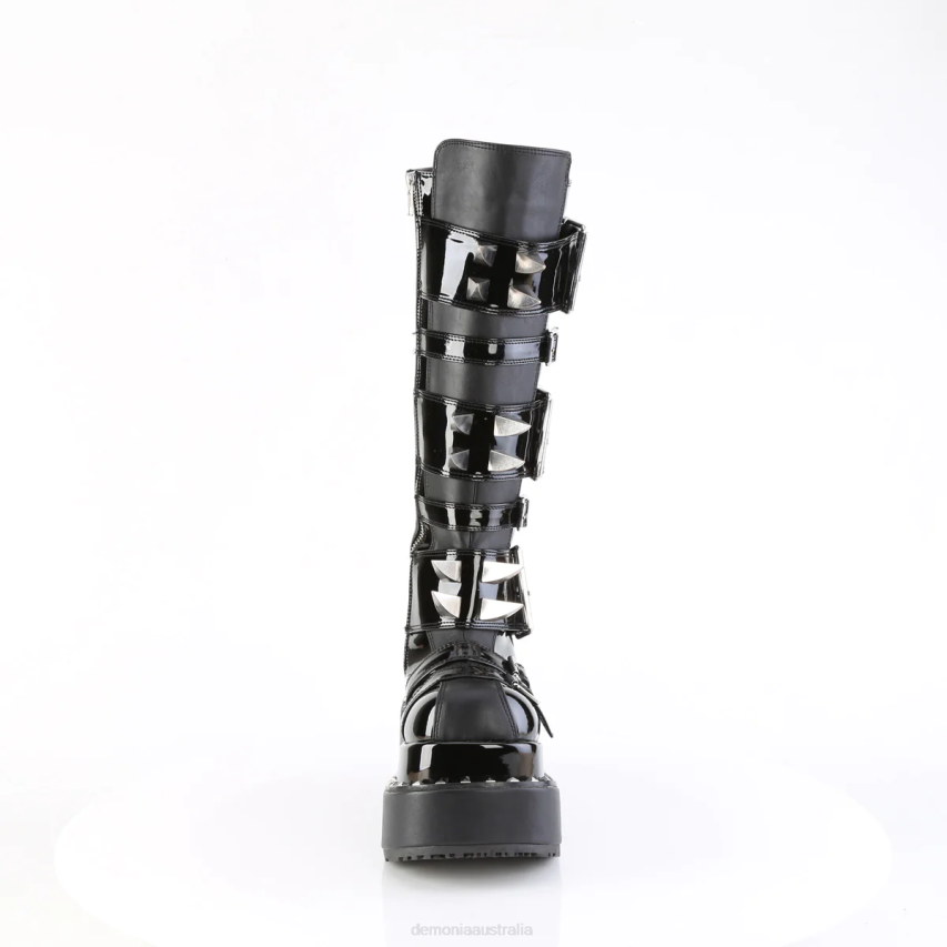 4 1/2inch (114mm) Tiered Pyramid Stud Trimmed Platform Knee High Boot Featuring Metal Claw Spiked Multi-Size Buckle Strap Closure, Inside Metal Zip Closure