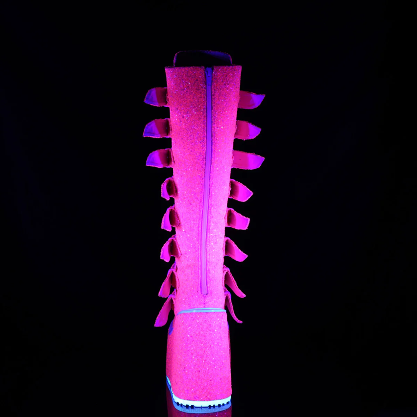 5 1/2inch (140mm) Platform Knee High Boot Featuring 8 Buckle Straps W/ Metal Plates At Center, Back Metal Zip Closure