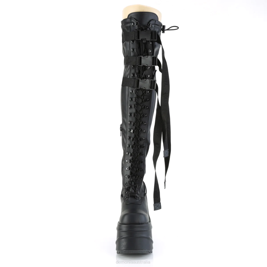 Make A Dramatic Entrance With The Wave-315 Thigh-high Boots, Featuring An Impressive 6-inch Wedge Platform That Commands Attention. The Boot's Stretch Vegan Leather Hugs Your Legs For A Contemporary, Body-conforming Fit, While The Lace-up Front Ensures A Personalized Touch. Details Include Three Hanging Nylon Straps Bearing Branded Snap Buckles, Adding Visual Interest, And An Elastic Top With A Toggle For Fit Adjustment. Accessibility Is Afforded By The Half-length Zip Closure On The Inside, Making These Boots As Practical As They Are Stylish.