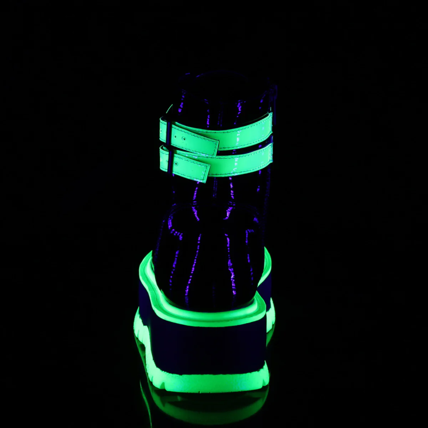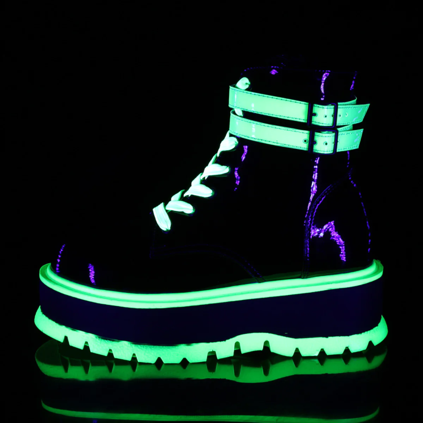 Introducing The Slacker-52, An Ankle Boot That¡¯s Anything But Lazy In Style. Elevate Your Wardrobe With A Plush 2inch Platform And Assertive Lace-up Front. Dual Buckled Ankle Straps Add A Hint Of Rebellion, While The Convenient Inside Zip Closure Offers Practical Ease. But The True Showstopper? The Boot¡¯s Black UV Iridescent Green Finish That Catches The Light And Eyes With Every Step. Perfect For Nights Out Or Adding A Splash Of The Extraordinary To Your Daily Look.