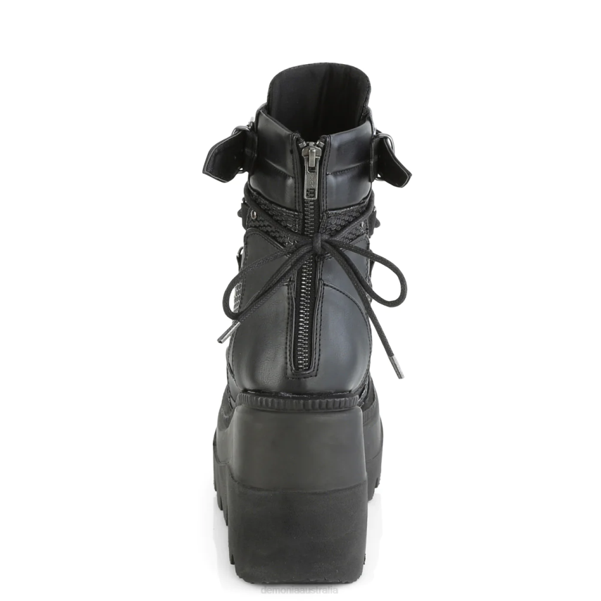 Meet The Shaker-60, A Fierce Combination Of Edgy And Stylish Design. The Black Vegan Leather Construction Of These Boots Is Adorned With Studded Contrast Panels And Pewter Tone Hardware, Providing A Head-turning Look That's Sure To Impress. The 4 1/2inch Wedge Platform Adds Height And Comfort, While The Dual Buckle And Lace-up Design Ensure A Secure Fit. The Shaker-60 Also Comes With A Spike Studded Metal Plate And Large O-ring, Adding An Extra Dose Of Attitude And Style To These Already Bold Boots. The Metal Back Zip Closure Adds A Touch Of Convenience, While The Overall Design Brings Punk Rock Flair To Your Look. Whether You're Stepping Out For A Night On The Town Or Just Want To Add Some Edgy Style To Your Everyday Wardrobe, The Shaker-60 Has Got You Covered. Make A Statement And Turn Heads With These Fierce And Unforgettable Boots.