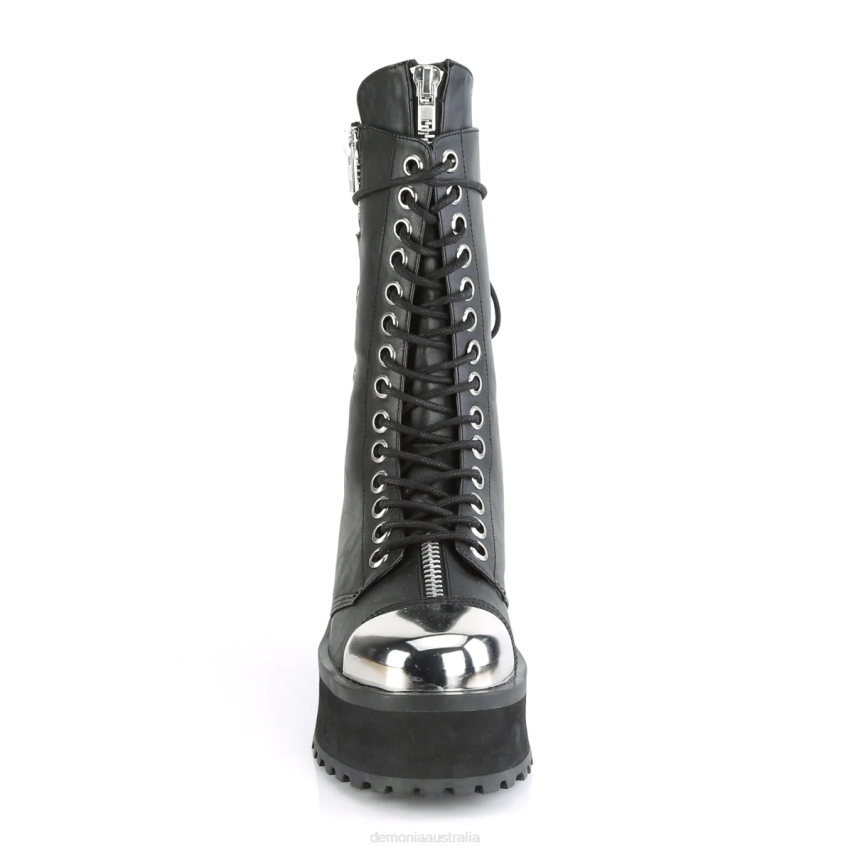 2 3/4inch (70mm) Platform Lace-Up Mid Calf Boot W/ Silver Chrome Plated Metal Toe Cap & Ornamental Zipper Details On The Tongue & Outer Side, Metal Back Zip Closure