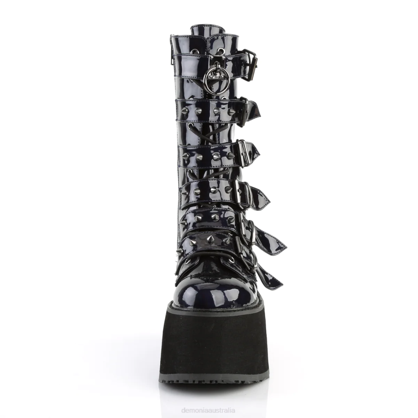 Elevate Your Style With The Damned-225 Mid-calf Boots. With A 3 1/2inch Platform And A Lace-up Front, These Boots Are The Perfect Combination Of Edgy And Chic. The Six Cone-studded Buckle Straps Add A Touch Of Rebelliousness, While The Inside Metal Zip Closure Ensures Easy On And Off. Crafted From Black Hologram Vegan Leather, These Boots Not Only Look Stunning But Also Make A Statement About Your Ethical Values. Embrace Your Individuality And Rock The Damned-225 Boots With Confidence.