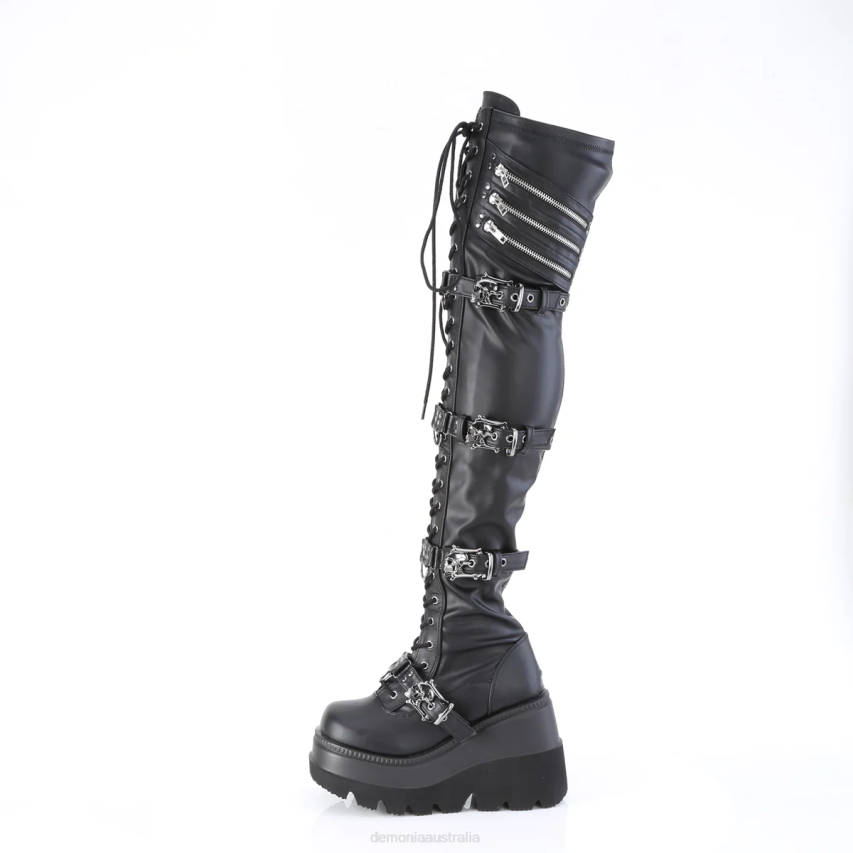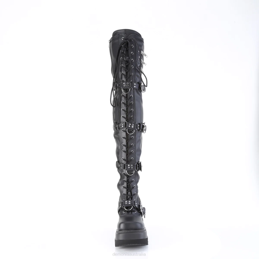 Elevate Your Look With The Shaker-420 ¨C An Ultra-chic, Wedge Platform Thigh-high Boot With A Bold Attitude. The Front Lace-up Design, Quadruple Skull Buckle Strap, And Ornamental Zip Closure Details Will Make An Impact On Any Outfit. The Full Inner Side Zipper Closure Allows For Easy On And Off, While The Black Stretch Vegan Leather Ensures A Perfect Fit. Ideal For Those Who Like To Express Their Edgy Style, This Thigh-high Boot Adds Just The Right Touch Of Attitude To Any Outfit.