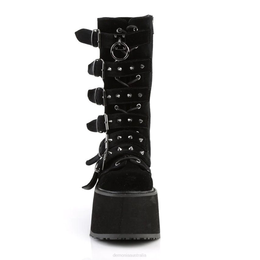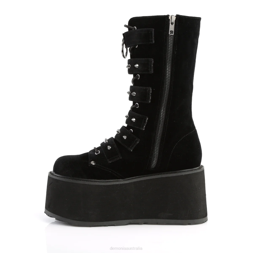 Step Into The Night With Damned-225, A Pair Of Mid-calf Boots That Redefine Edgy Elegance. Crafted With Plush Black Velvet And Standing On A 3 1/2inch Platform, These Boots Exude A Dark Allure. The Lace-up Front Is Both Stylish And Functional, Leading The Eye To Six Cone-studded Buckle Straps That Wrap Around Your Calves Like A Manifesto Of Alternative Fashion. Complete With A Handy Inside Metal Zip Closure, The Damned-225 Boots Are The Epitome Of Gothic Glamour, Ready To Elevate Your Ensemble And Make A Statement Wherever You Tread.
