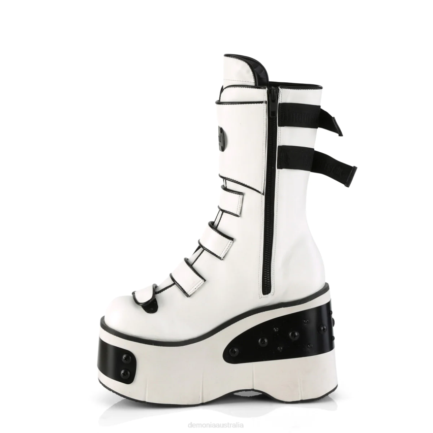 4 1/2inch (114mm) Front & Back Metal Plated Platform Strappy Mid-Calf Boot Featuring Front Sheild W/ Branded Metal Plate Center Detail & Dual Snap Buckles And Hook & Loop Straps On The Remaining Straps,